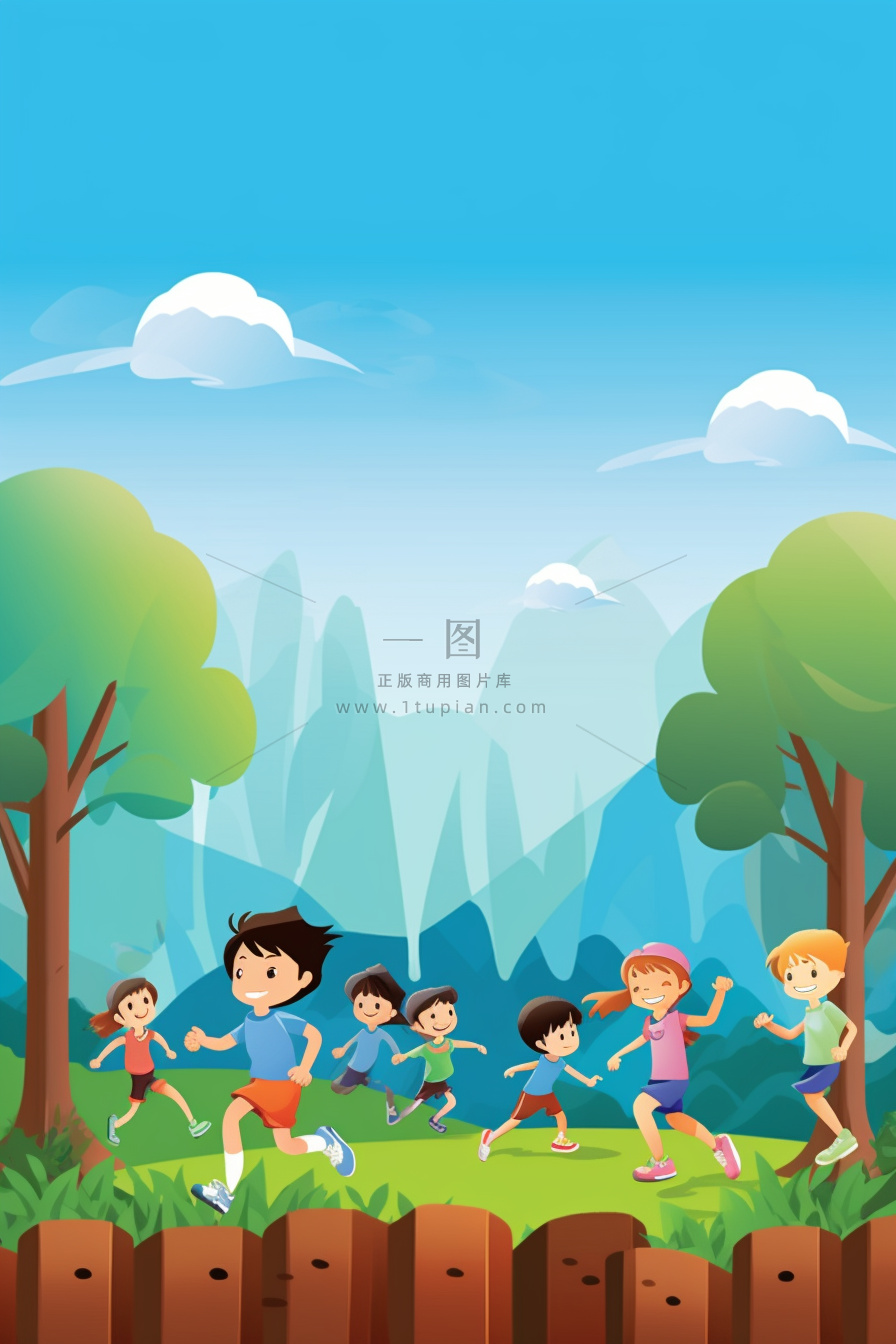 儿童孩子们大自然草原森林游玩卡通背景 -