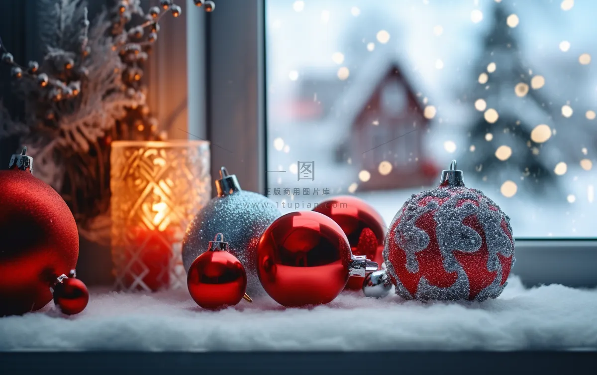 与该图片相关的标签为:圣诞装饰品喜庆礼物红色雪景窗外摄影