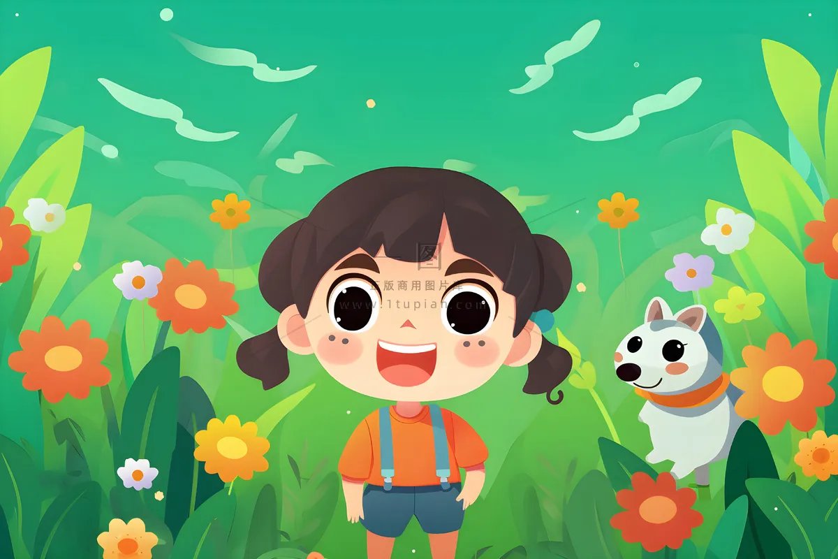 儿童躺着绿色草地上花草海报插画素材背景;小女孩在绿色草地上的花朵海报;绿色草地上的女孩和狗;女孩在绿草地上玩耍的插画背景;小女孩在鲜花和绿色草地上微笑;女孩在绿色草地上与花朵和狗互动的插画;小女孩在绿色草地上与花朵和狗玩耍。