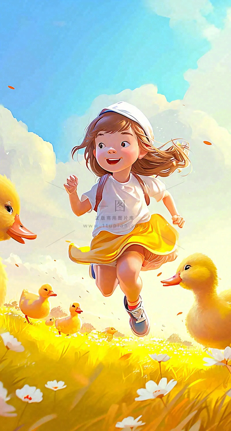 儿童节可爱鸭子奔跑,蓝天白云草地童真玩耍,清新插画;快乐的小鸭在草地上奔跑可爱的孩子们一起玩耍美丽的蓝天白云;童真孩子们在田野里奔跑可爱的鸭子们跟随着一个充满想象力的场景;奔跑的可爱女孩和鸭子在草地上蓝天白云下插画;草地上的快乐小鸭子们;草地上的快乐时光一群可爱的鸭子在草地上奔跑背景是蓝天白云;快乐的孩子在田野里奔跑彩色鸭群伴随宁静如画。