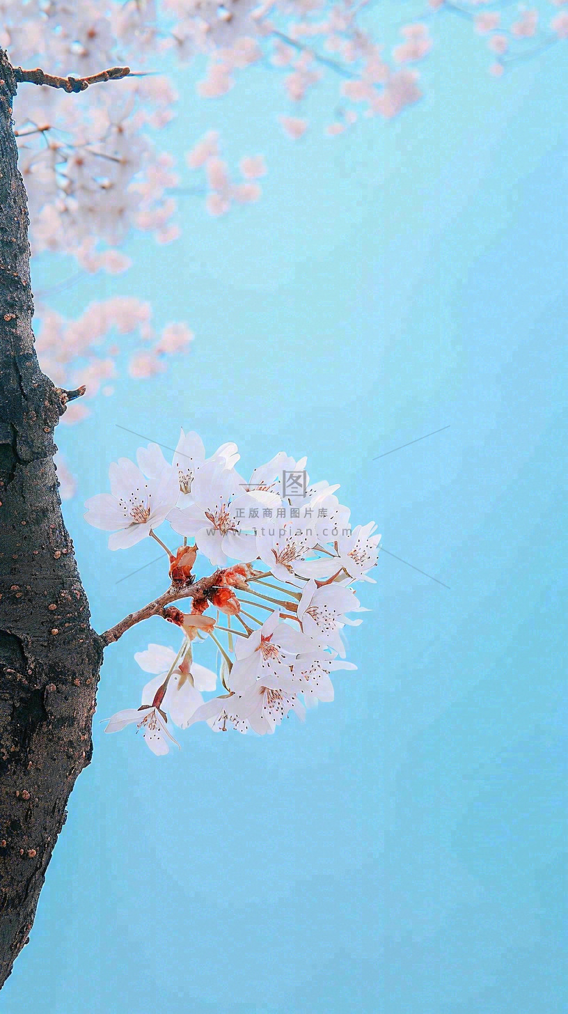 蓝色浪漫白色樱花花朵枝叶,立春惊蛰春分摄影图 -