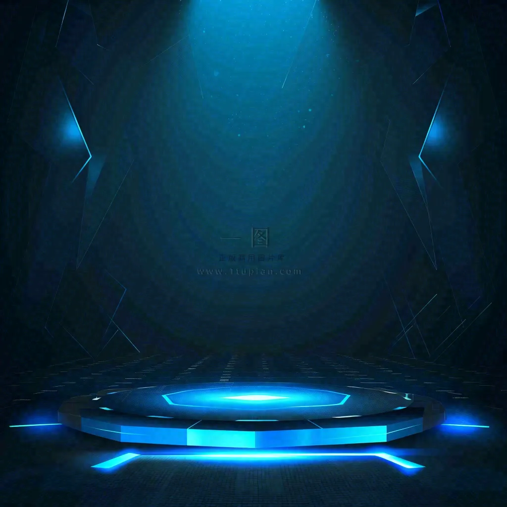 图片内容描述:这幅图片展示了一个光滑的、蓝色的平台,上面有一个发光的圆形区域。这个平台位于一个黑暗的房间内,墙壁和天花板都是黑色的。平台位于房间的中心位置,为周围环境提供了一个焦点。